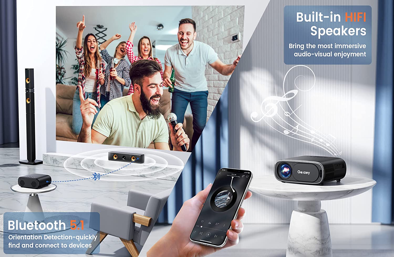 • ♫【5.1 Bidirectional Bluetooth & HIFI Audio & Unique Wallpaper】 The projector newest chip with "orientation detection" allows quick search and connection with your device while reducing interference from others. Built-in HIFI speaker with DSP tech, it's both a smart projector and an independent Bluetooth speaker. You can enjoy clearer and more realistic sounds. Variety of themes for you to choose from and you can also set your favorite picture as wallpaper to create a unique movie projector!