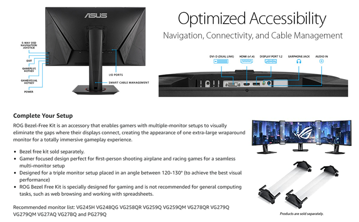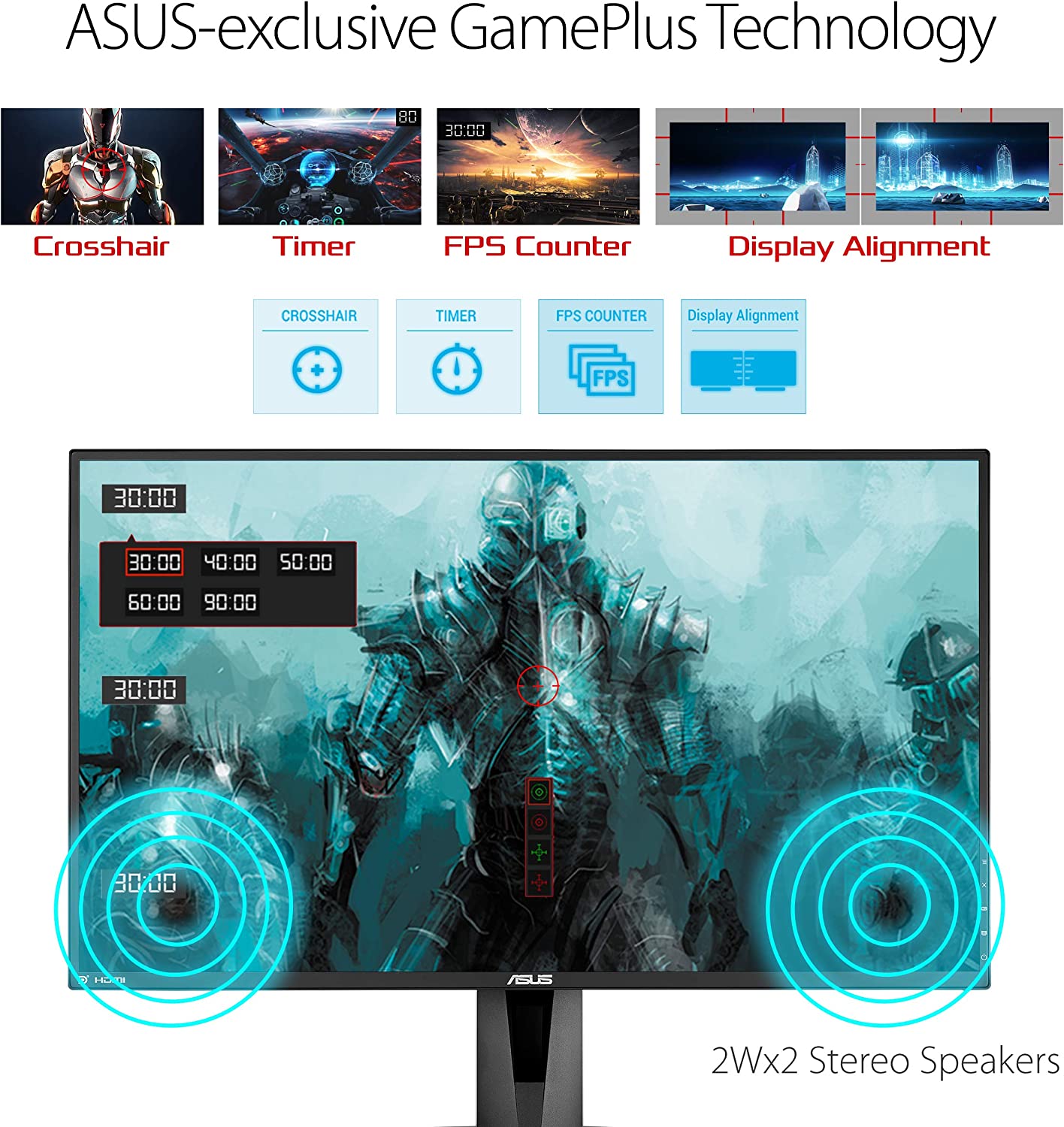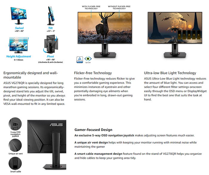 Make every millisecond count with the 27” VG278QR gaming monitor featuring a 165Hz refresh rate and 0.5ms response time with Asus’ ELMB technology to reduce motion blur with free Sync and G-SYNC compatibility Turn any desk into a marathon battle station with vg278qr’s ergonomic adjustable stand and eye Care technology. Dimension without Stand (WxHxD): 24.37 inches x14.29 inches x 1.96 inches.