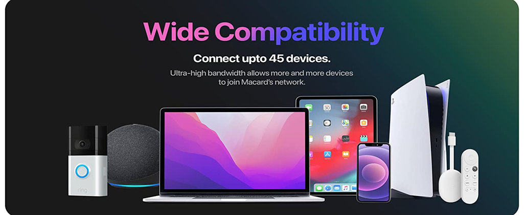 - 45 Devices, Zero Bog - House full of data hogs? Macard’s internet range booster with ethernet port eliminates the problems fast, pumping out interference-free, lightning fast data capabilities to all the tablets, smart speakers, Alexa devices for home, IP cameras and whatever the innerwebs invents next. Without bogging your own stream down.