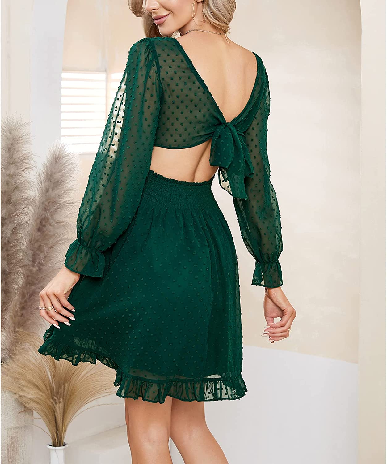 • Design: v neck, puff long sleeve, ruffle cuff, drawstring, ruched front, cutout, smocked waistband, A line, frill hem, flowy swing dress, backless, tie back, Swiss dot, mini dress