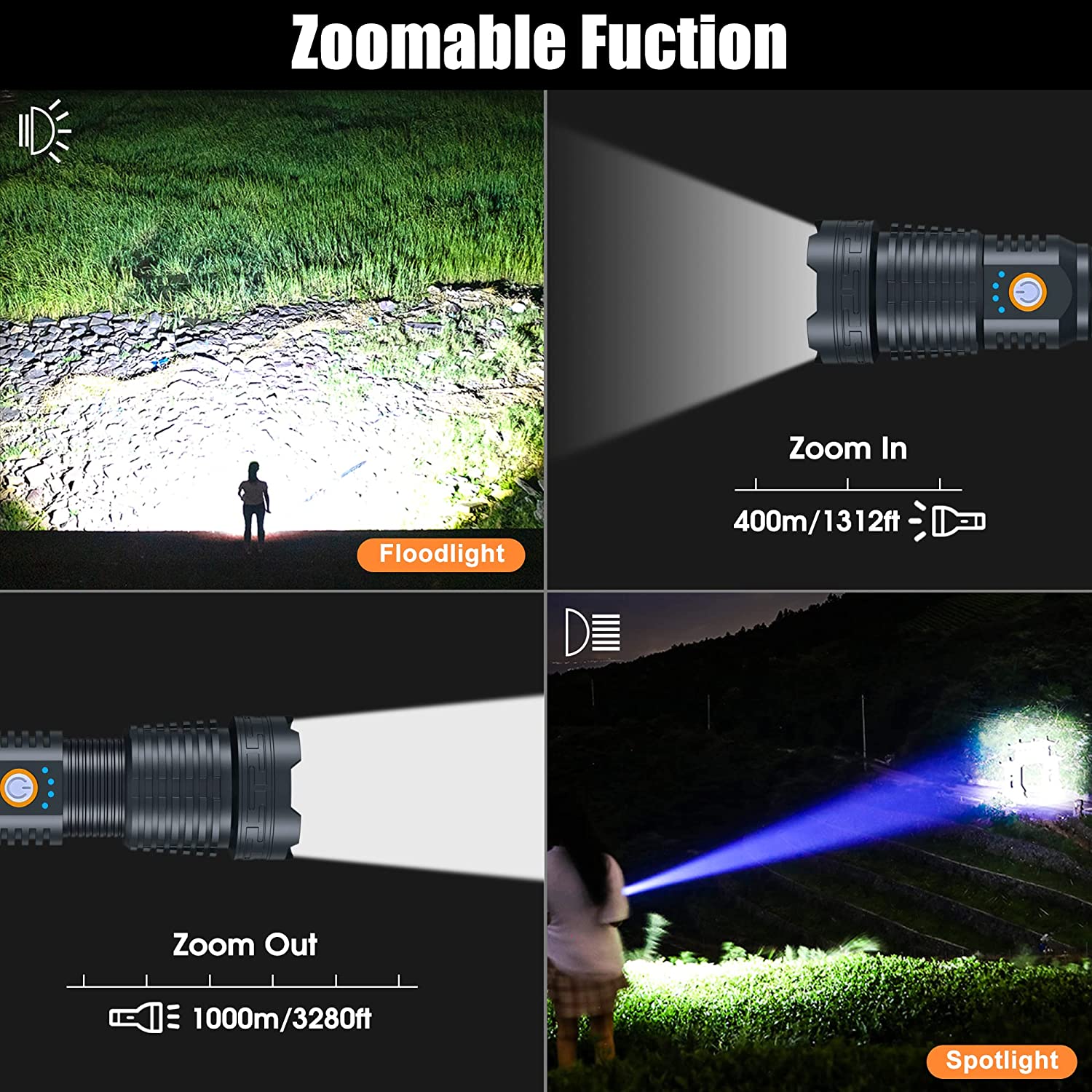 ?【ZOOMABLE ADJUSTMENT】?Super bright LED flashlight has a telescopic zoom function. Zoom out the super bright rechargeable flashlights and switch to spotlight mode, suitable for long-distance observation, zoom in the super bright rechargeable flashlights and switch to floodlight mode, uitable for large area observation. According to your needs, you can choose to use spotlights or floodlights, which is very practical.