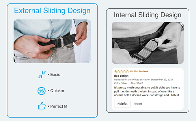 ✦【External Wearing】: Compared with an internal sliding invisible nylon belt which must put your finger underneath the belt and is difficult to tighten, our outside tail design needs to hold the tail, for one second to tighten up, much easier and quicker.