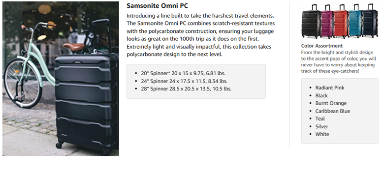 Introducing a line built to take the harshest travel elements Omni PC combines scratch resistant textures with the lightest 100% polycarbonate construction, ensuring your luggage looks as great on the 100th trip as it does on the 1st. This lightweight line offers heavyweight protection riding on effortless 360 spinner wheels. Don't pull your case; let Omni PC roll comfortably beside you on your journey. Design includes expansion for added capacity when needed. TSA locks ensure your belongings arrive safely to your destination. Extremely lightweight and visually impactful, this collection takes 100% polycarbonate design to the next level. Hardside Care: To clean hardside luggage, we recommend using a gentle soap and warm water, rinsing well. If you would like to wax the case after cleaning, any good silicone-base automobile or furniture polish will preserve the luster and add resistance to the covering. We do NOT recommend, however, that you try to clean the luggage with a combination cleaner-polish. Shell material is made of injection molded polycarbonate, a highly impact-resistant plastic that is strong and lightweight.