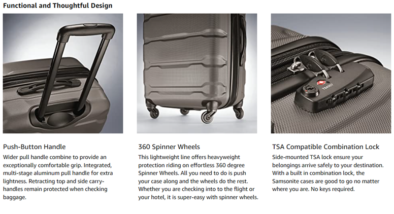 • FOUR, MULTI-DIRECTIONAL OVERSIZED SPINNER WHEELS for effortless mobility, re-engineered lightweight