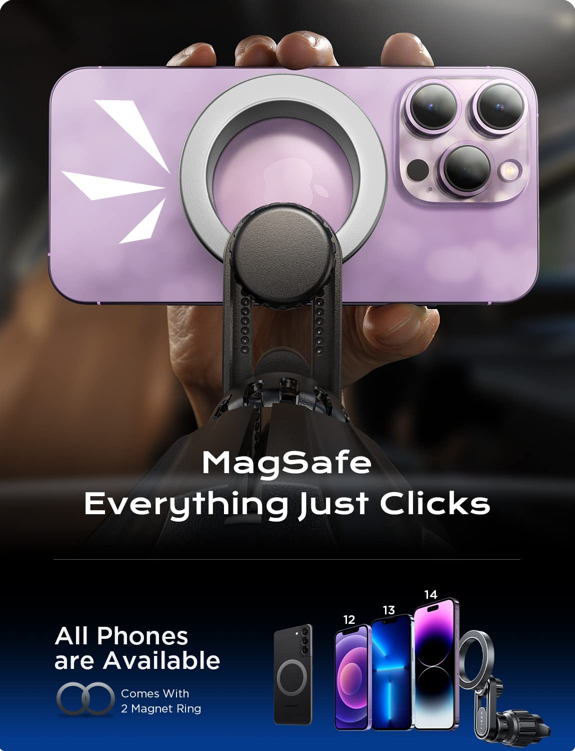 ?Directly with iPhone 14/13/12/mini/pro max Car Accessories, Won’t Block Wireless Charging, for magsafe case car holder without additional magnet metal plate. Just get close and automatically snap to the magnetic air vent car mount for iPhone fits magsafe, enjoy Hands-free keeping your phone firmly! Work for All Android Phones: We provide extra 2 metal rings, fits other iPhone case and Android phones without magsafe