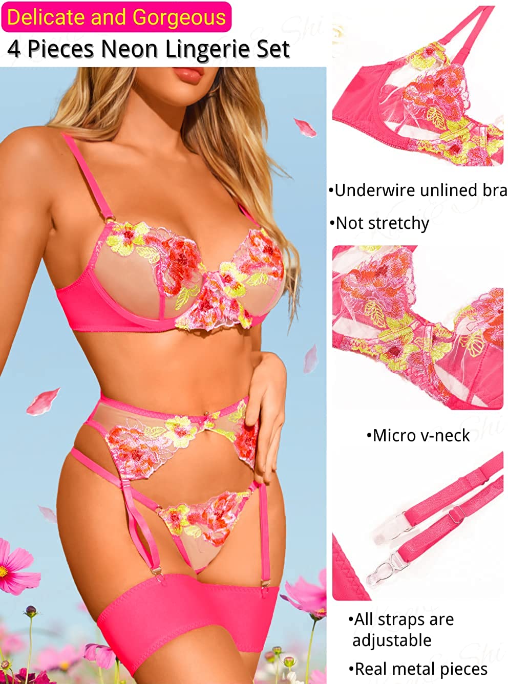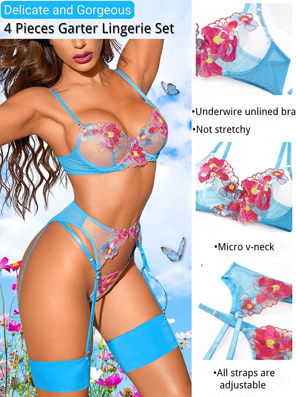 Kaei&Shi Floral Embroidered, Underwire, G-String, Garter Belt, 4 Pieces Lingerie