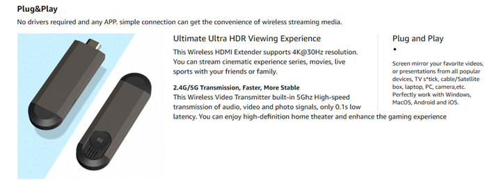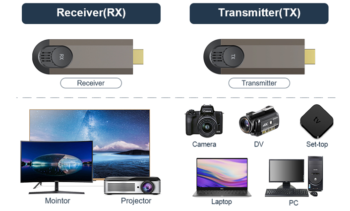 - [Plug & Play] No need any APP, simple connection can get the convenience of wireless streaming media.No software or WiFi connection required. Get up and running in 20 second with a true plug-and-play experience.which solves the problems for the traditional HDMI cable connection and wiring trouble, aesthetics affecting and the short transmission distance. Connect the transmitter to the HDMI source, then connect the receiver to the HDTV/Projector , connect the power, and you are ready to go.