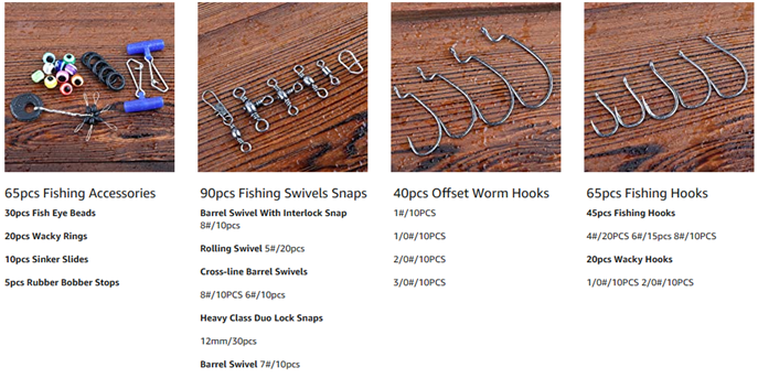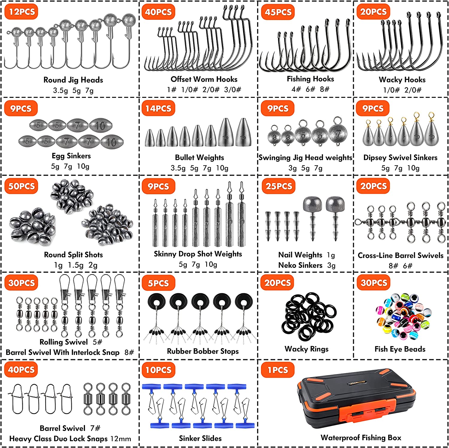 - 【Complete Fishing Tackle Kit】- PLUSINNO 397pcs fishing gear is loaded with 12 fishing rigs for fishing enthusiasts and beginners. It collects nearly all fishing accessories including Fishing Hooks, Round Jig Heads, Round Split Shot, Egg Sinker, Dipsey Swivel Sinker, Drop Shot Weights, Bullet Weights, Nail Weights, Neko Sinkers, Fishing Snap, 4 kinds of different Fishing Swivels, Fishing Sinker Slider, Fish Eye Beads, Wacky Rings and Bobber Stops.