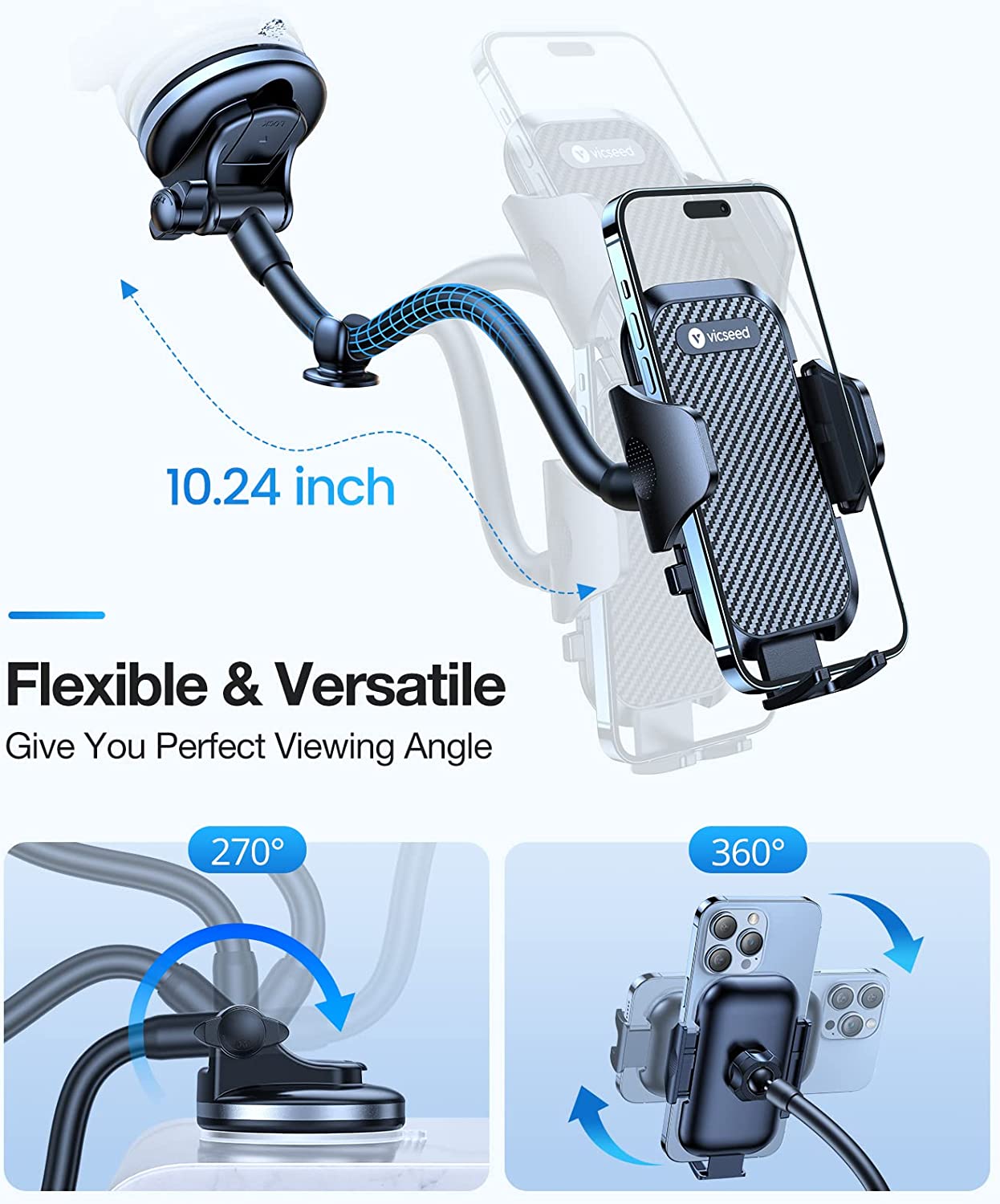 • ?[Most Flexible, Perfect View] With the 360-degree swivel joint, 10.24" long flexible gooseneck which is made of durable aviation-grade aluminum alloy, you can adjust your mobile phone to the most comfortable view. VICSEED car cell phone holder for android will keep your phone always close to you, ready for hands-free calls, GPS navigation & listening to music. No need to lower your head or be distracted while driving, make your journey safer.