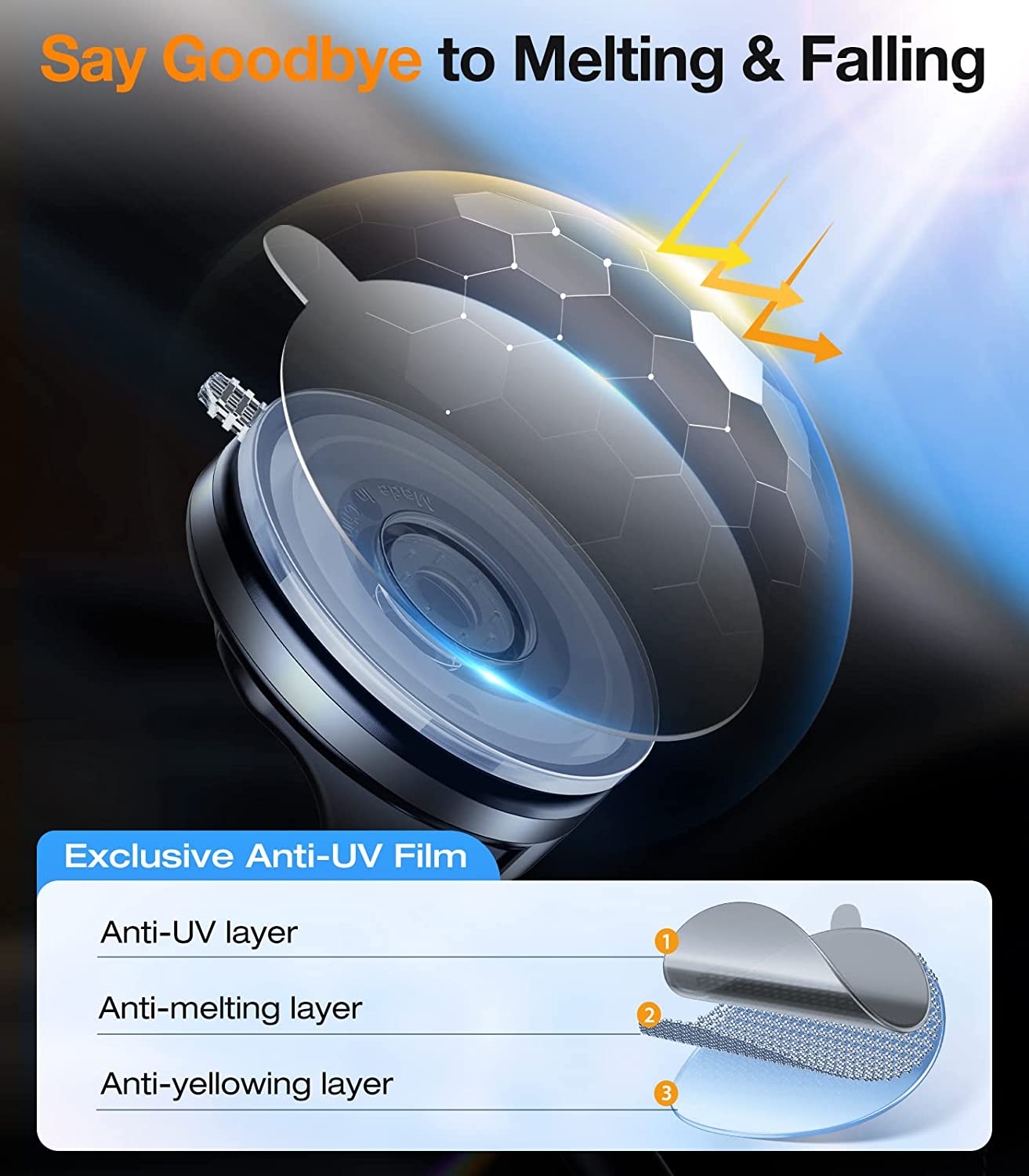 • ?[No.1 Anti-UV Film, No Melt & Fall] The suction cup of the dashboard phone holder for car on the market always melts or yellows then fall off. We developed the FIRST windshield Anti-UV film, which passed 1000+ high-temperature tests, and blocks 98% ultraviolet and infrared rays. Therefore the cellphone holder car can stand 220°F High TEMP! Even in Texas, this cell phone mount for car with Anti-UV film will never melt & fall off and keep your window clean away from the ugly marks.