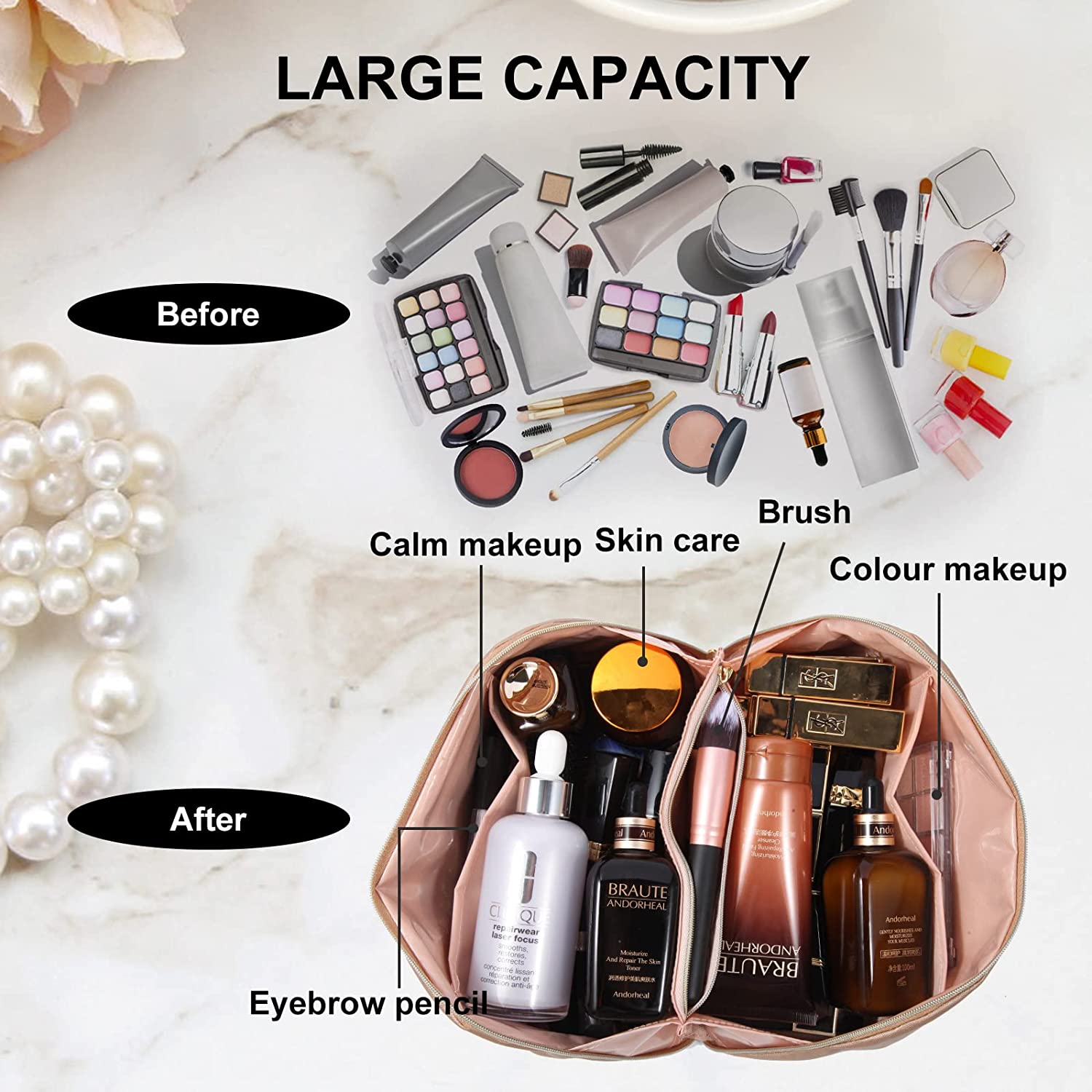 • ?LARGE-CAPACITGY COSMETIC BAG :The large capacity travel cosmetic bag is designed with multiple divisions and compartments, which can store not only your cosmetics,makeup bursh,essential oils, Toiletries kits, valuables, etc. It can be organized to accommodate the cosmetics and makeup tools you need;