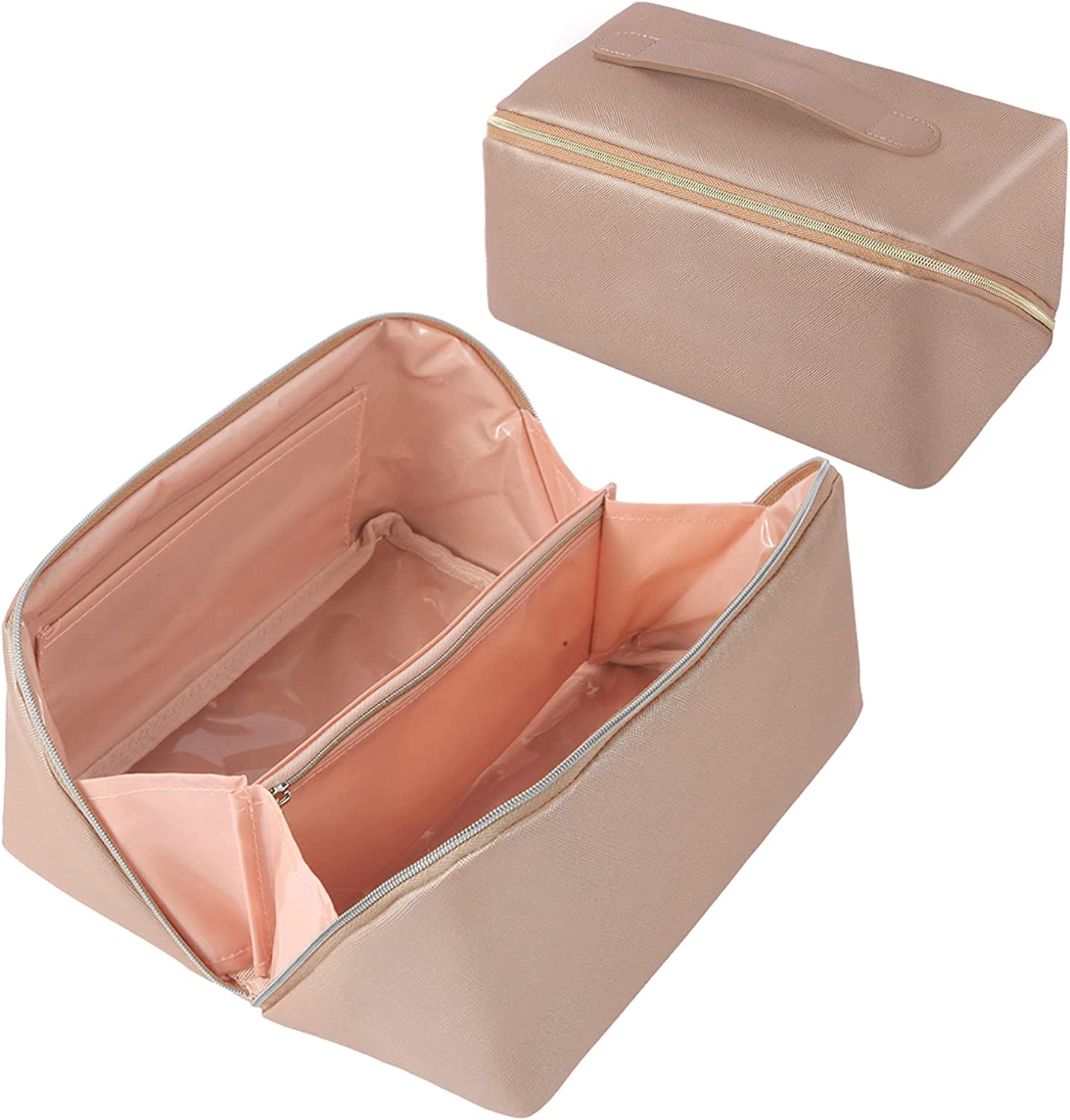 QFDS Large Capacity Travel Cosmetic Bag-Makeup Bag,Portable Leather Waterproof Women Travel Makeup Bag Organizer,with Handle and Divider Flat Lay Cosmetic Bags (Champagne gold)