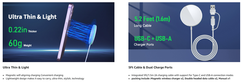- ?【What You Get】: 2 x Fast Wireless Charger connecting Type-C/USB-A Ports and 5ft Charging Cable.1*Manual, Package Color Box. It is recommended to use an adapter with 18W or higher power to ensure the normal operation of the magnetic charger. (AC adapter not included)