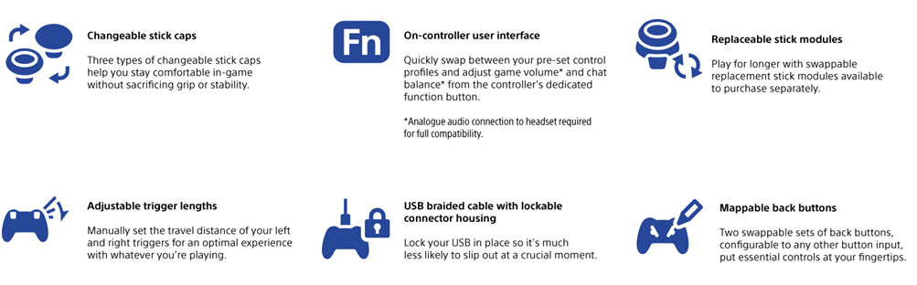 Get an edge in gameplay by creating your own custom controls to fit your playstyle. Built with high performance and personalization in mind, the DualSense Edge™ wireless controller invites you to craft your own unique gaming experience so you can play your way. Ultra-Customizable Controls: Changeable stick caps, remappable inputs and custom settings make your DualSense Edge™ wireless controller uniquely yours. Fine tune your aim by adjusting stick sensitivity and dead zones, set the travel distance of your triggers for faster inputs, and quickly swap between control profiles so you’re always ready for your next game. Mappable Back Buttons: Swappable back buttons can be configured to any other button input, so you’ve always got game-changing actions and essential controls at your fingertips. Plus, with two different styles of button to choose from, you can pick an input type that feels just right for your playstyle. DualSense™ Wireless Controller Features Built In: Enjoy all the immersive features of the DualSense™ wireless controller and our signature controller comfort. Experience varying force and tension at your fingertips with adaptive triggers and feel your in-game actions and environment simulated through haptic feedback. Replaceable Stick Modules: Play for longer with swappable replacement stick modules available to purchase separately. Haptic feedback and adaptive trigger features available when supported by game.