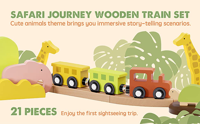 ?Safari Theme Wooden Train Set: Driving your first train and having a wonderful visit to the zoo! Toddlers aged 1-3 can explore different shapes of animals by "traveling" in the zoo. The rhythmic click-clack sound of the toddler toys on the wooden train track leads babies into the world of imagination.