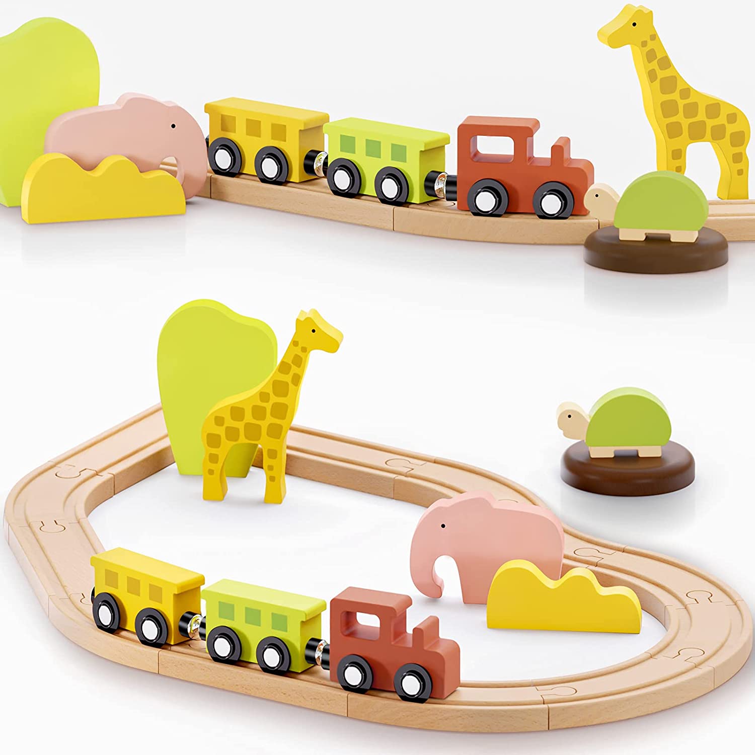 ?Great First Train Set for Toddlers: Storytelling and creative play are never-ending! Explore different shapes of animals with toddler toys, including elephant, giraffe, and Tropical Turtle to encourage children to learn about various colors and animals. Double-Side design wooden train tracks help to motivate kids' creativity and hands-on skills.