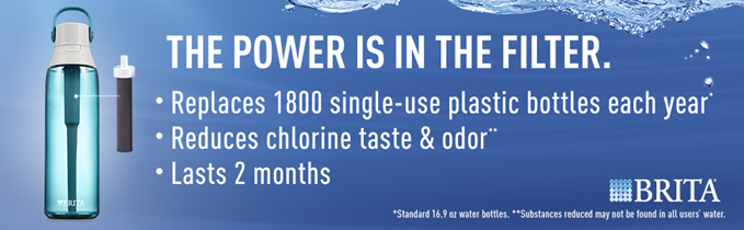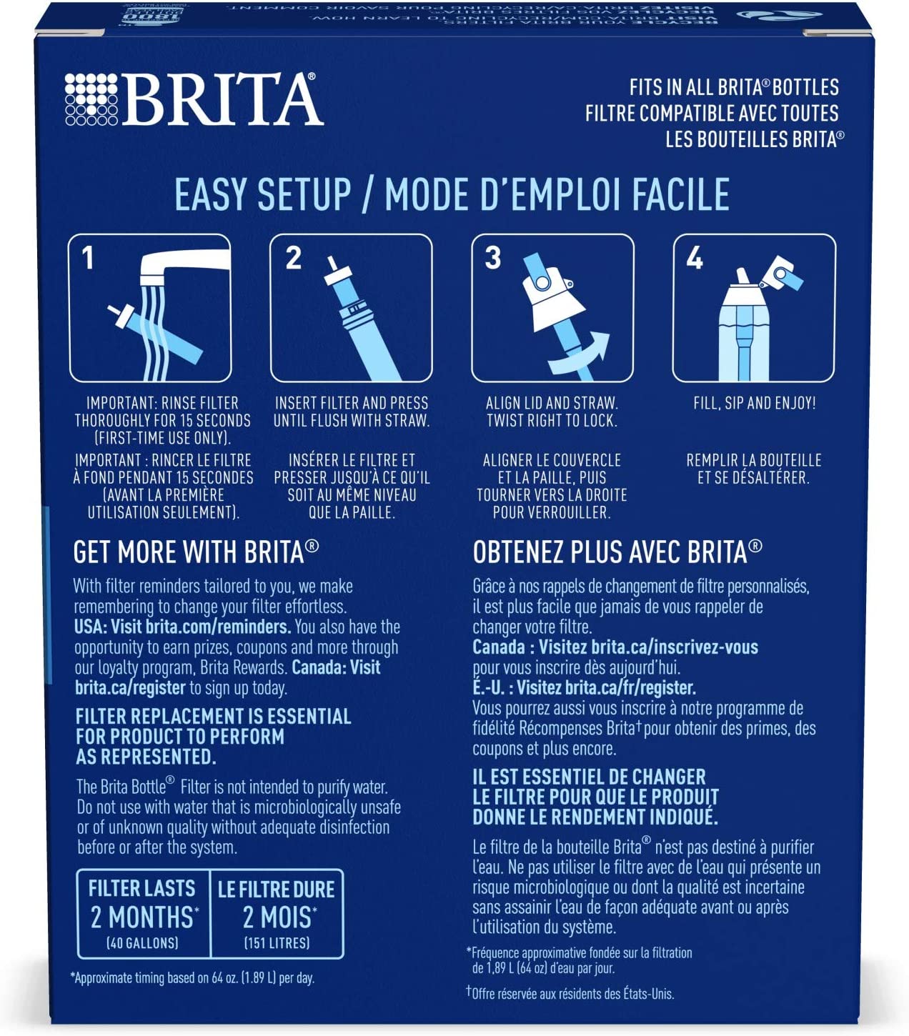 Brita Water Filter Bottle Replacement Filters fit all Brita Hard Sided and Sport Water Bottles. These filters are BPA free and help reduce chlorine taste and odor commonly found in tap water to deliver great tasting water every time. One filter can replace 300 standard 16.9 ounce plastic bottles resulting in less money spent and less plastic waste. For optimum performance, filter should be replaced every 40 gallons or very two months, whichever comes first. Use Brita for better water, a better world, and better value.