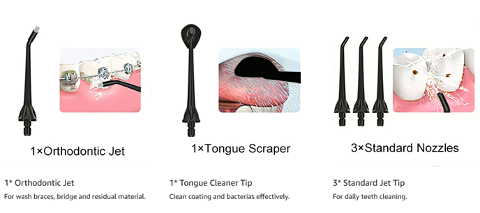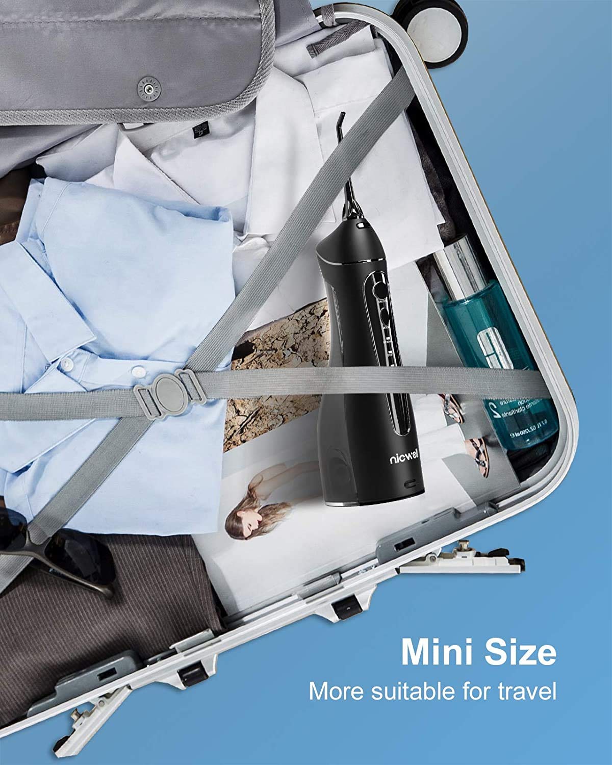 CARRY ON SIZE: Cordless & small size, this water teeth cleaner picks is ideal for travel, 5 interchangeable jet tips included for your whole family. The 360°rotatable nozzle allows you to easily clean areas that are difficult to reach and prevents tooth decay, dental plaque,dental calculus,gingival bleeding and dental