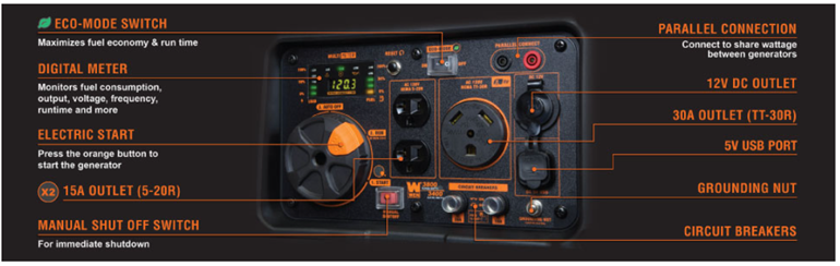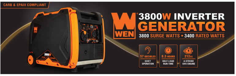 Remember when you had clean and quiet portable power? The WEN 3,800 Watt Inverter Generator produces clean energy free of voltage spikes and drops without making all of the noise of a regular generator. Generate up to 3800 surge watts and 3400 rated watts of power. Our 212cc 4-stroke air-cooled OHV engine operates at an extremely quiet 57 decibels at quarter load, about as quiet as a window air conditioner or the average conversation. This limits its invasiveness while hunting, camping, tailgating and restoring back-up power. The WEN 3800W Inverter Generator is also equipped with fuel shutoff. This feature turns off the flow of fuel, allowing the generator to use up the remaining fuel from the carburetor before automatically shutting down. This helps fight the build-up and blockages caused by stagnant fuel inside of the carburetor, minimizing maintenance while prolonging the unit’s lifespan. Designed to mirror a pure sine wave, this generator limits total harmonic distortion to under 0.3 percent at no load and under 1.2 percent at full load, making it safe enough to run laptops, cellphones, monitors, tablets and other vulnerable electronics. The lightweight design along with the built-in wheels and folding handle make for easy portability while the ultra-efficient 2.2-gallon tank provides over 8.5 hours of half-load run time. Our fully-packed panel comes equipped with two 3-prong 120V standard household receptacles, one AC 120V 30A NEMA TT-30R receptacle, one 12V DC receptacle, two 5V USB ports and an easy-to-read digital fuel and load display. Maximize fuel economy by engaging the Eco-Mode switch. This feature allows the generator's engine to automatically adjust its fuel consumption as items are plugged into and unplugged from the panel, preventing the usage of unnecessary gasoline. The oil access cover makes for easy oil changes. Need more energy? Easily link up two WEN inverter generators using a WEN GNA50i 50-Amp 6000-Watt Parallel Connection Kit (sold separately) in order to share wattage between multiple units. Low-oil and low-fuel automatic shutdown, indication lights, and overload protection safeguard both your generator and your electronics from damage. The included spark arrestor allows for legal use in national parks and campgrounds. And because this is a WEN Product, your inverter generator comes backed by a 2-year warranty, a nationwide network of skilled service technicians and a friendly customer helpline. Remember when your generator powered your electronics safely and quietly? Remember WEN.