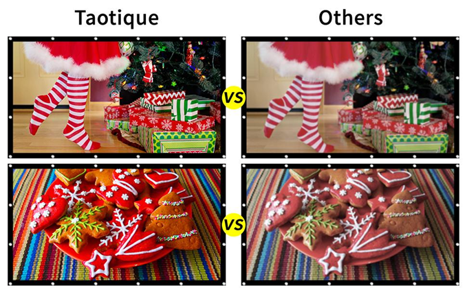 - Wrinkle Free Material - The 120 inch projector screen used soft touch and stretchy thick polyester fiber material to ensure wrinkle free after folded or compressed, providing clearer images, brighter colors and no color cast. Please be assured that all of our outdoor movie screen will undergo rigorous quality inspection process before sending out, so there will be no any spots on the screen to affect the viewing experience and is thick enough that you can't see what's behind it.