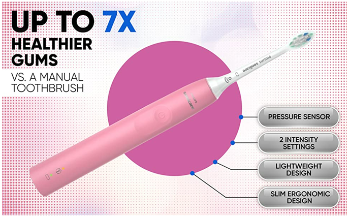 • Pressure Sensor helps protect your teeth and gums - Built-in pressure sensor automatically detects pressure you apply, warns you, and reduces the toothbrush vibrations automatically to help protect your gums. The toothbrush will make a pulsing sound as a reminder to ease off the pressure. 7 out of 10 people found this feature helped them become better brushers.