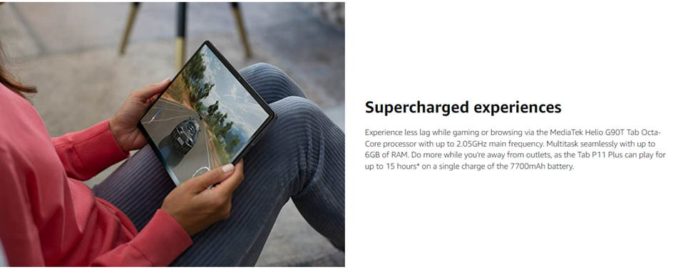 Experience first-class multimedia and fun with the Lenovo Tab P11 Plus. This Android tablet features a large, 11-inch screen with 2K resolution. You'll enjoy beautiful video in the IPS LCD touch display and great audio through quad speakers with user-facing stereo tuned by Dolby Atmos®. Inside, you'll find a powerful octa-core chip, 4GB + 128GB memory. Plus, this slim and lightweight tablet delivers epic battery life in an aluminum-alloy design with a dual-tone finish available in an elegant slate grey color.Running the Android™ 11 operating system, the Tab P11 Plus tablet offers Bluetooth® and Wi-Fi wireless connectivity and a USB Type-C™ 2.0 port for data transfer and charging. You can also use the USB-C port to attach a compatible headset. Use the front or rear camera to take photos or enjoy a family video chat – this Android tablet comes with a dual microphone array and quad speakers so you'll experience crisp, clear video and sound. You can even log in quickly and easily with Face Unlock.